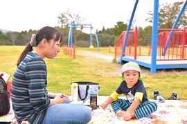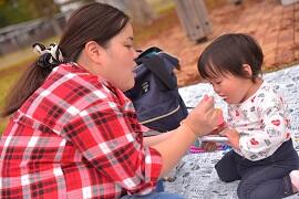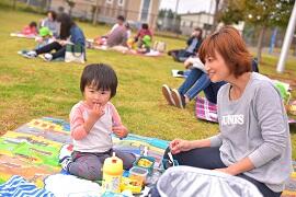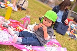 芝生の上で いいお顔! ベビーカーのお友だちも元気いっぱい。