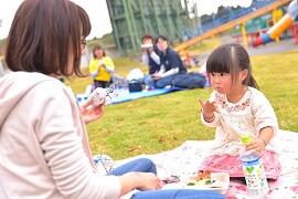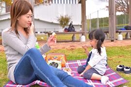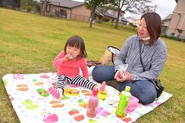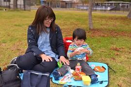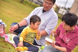 家庭弁当の日の一枚☆今回はホール横のデッキにシートを敷いて食べました!!