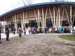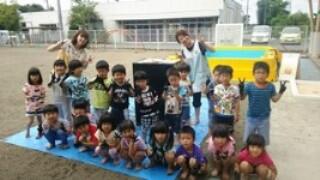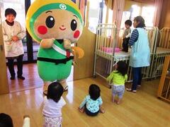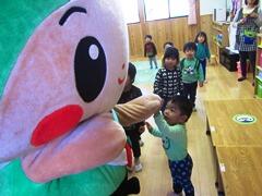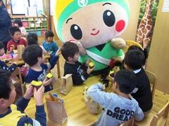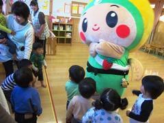 「はがまるくん」はみずはし保育園のおともだちに会えてうれ しくて思わずジャンプしてしまいました。
