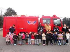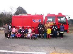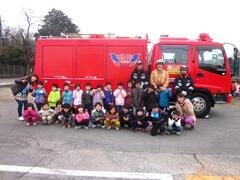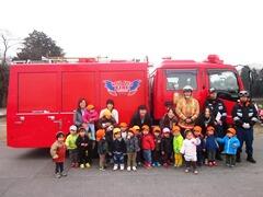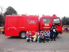 訓練のあとは、消防自動車の見学です。消防車の前でパチリ(^^♪