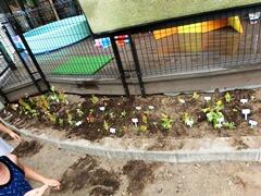 「チョキで優しくはさんで、ひっくり返して…」園長先生に教えてもらいながら植えました(^^♪
