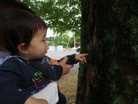 砂利駐車場では、砂利の上をよちよち歩いたり、ゴツゴツした大きな木の幹に恐る恐る触ろうとしたり…