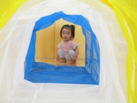 初めてのトンネルあそびは、長~いトンネルにびっくりして遠くからじっと見つめていました(笑)