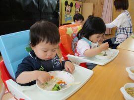 スプーンやフォークを持って頑張って口へ運んでいます