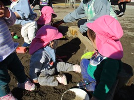 園庭であそぶのがとっても楽しいようで、あちこち歩き回ったり、砂場であそんだりしています。