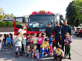 町内をパトロールしていた消防車がみずはし保育園にやってきました。お昼寝が終わると大きいクラスのお友だちが「保育園に消防車がいるよ~」と大騒ぎ。さくら組、ゆり組のお友だちは、慌ててパジャマから洋服に着替え消防車の待つ駐車場へ。消防士のお兄さん(笑)は、とっても優しくとってもかっこよかったです。