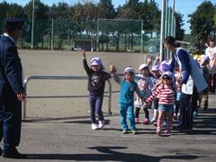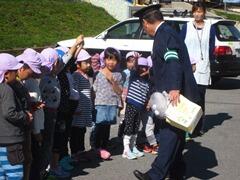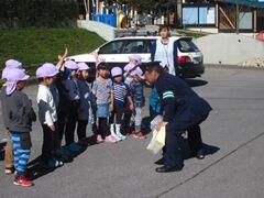 10月31日 交通指導がありました。年少・年中・年長児クラスの子どもたちが、町の交通指導員さんのお話しを聞き、実際に道路を歩きました。