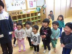 2歳児すみれ組さんもよく聞いていました。さいごに「お正月」の歌をうたい、締めくくりました。
