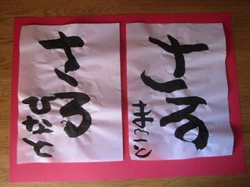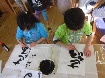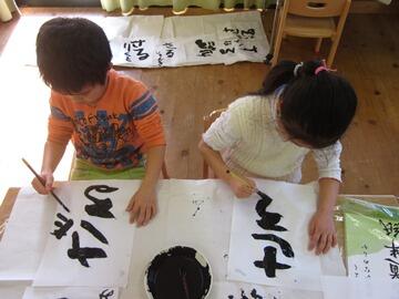 体を動かした後は、室内にて… 年長児は「ザ・書初め」