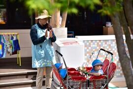 芝生の上で いいお顔! ベビーカーのお友だちも元気いっぱい。