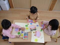 12月の製作活動は、「はじき絵」をしました。白のクレヨンでハートや丸・線を描いて好きな絵の具を選び筆で塗りました。「きれいー」と言って、オリジナルのマスクを作りました。展示していますので、リースと併せて親子でご覧ください。