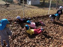 「楽しいなー もう1回!」と走るの大好きです。「一緒にあそぼ―!」と友だちを誘い、落ち葉や木の実集め・小石などで、あそびを工夫して楽しんでます。(^^♪