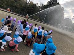 「総合避難訓練」では、消防車や放水の様子を身を乗り出して見ることが出来ました。