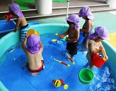 バケツやジョーロ、魚のおもちゃでお友だちと遊んでいます