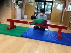 平均台にしがみついて「忍者」のように橋渡りに挑戦しました。