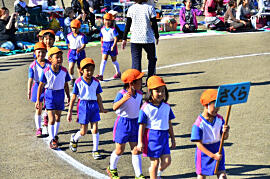 まずは、入場行進。さくら組ゆり組たんぽぽ組すみれ組は、親元を離れ自分の足でしっかりと歩いて入場です。つくし組もも組の小さいお友だちは、おうちの人と一緒に入場しました。