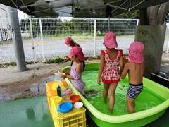 バケツやジョーロ、魚のおもちゃでお友だちと遊んでいます