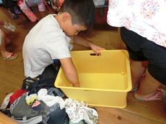 バケツを使って、水の中を観察中…そして水の中でジャンケン!