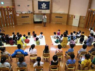 ひまわり・ばら・さくら組がホールに集まり、園長先生の話を聞きました。