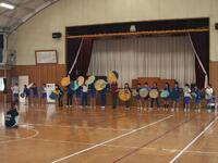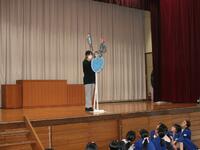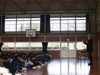 創立記念集会を行いました。本校は今年で創立45年目になります。学校に関するクイズや校長先生による校章についてのお話がありました。記念品として紅白まんじゅうを持って帰ります。