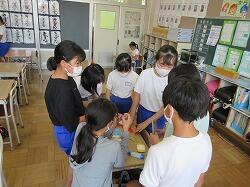 6年生が、理科の「体をめぐる血液」について、学習していました。どんなときに、血液が多く流れるのかについて話し合い、実際に体を動かしながら、脈をとって確認していました。