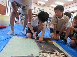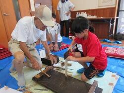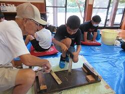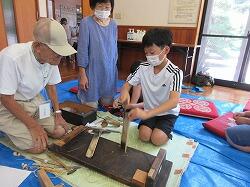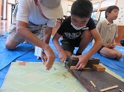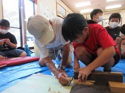 数年ぶりに、ワークショップが開催されました。初日は、「竹とんぼ飛ばし」です。なたを使った竹の割り方や、のこぎりを使った竹の切り方など、子供たちは、自分自身で竹とんぼ作りを体験をすることができました。上手くできない場面もありましたが、普段は手にすることのない道具をつかった貴重な経験となりました。