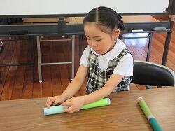 図工の授業で帽子を作りました。どんな形にするか、帽子の高さはどうするかなどいろいろ考えて素敵な帽子が完成しました。完成した後には友達の作品を見て、素敵なところを見付けました。
