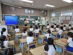 式終了後には、児童指導主任から、3台の車の絵を紹介しながら、安全な夏休みの過ごし方について、話がありました。