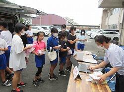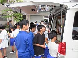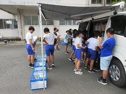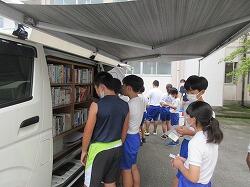 今日は、子供たちが楽しみにしている「とっくん号(移動図書館)」が来校しています。