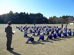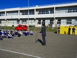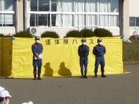 駆けつけた警察官と職員で不審者を取り押さえた後、校庭に集まり真岡警察署生活安全課スクールサポーターの方から話を聞きました。