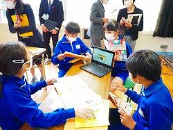 電子黒板が全クラスに設置されていないため、一部のクラス(1年1組、1年2組、4年1組)が多目的教室に集まって式を行い、その様子をリモートで各クラスの電子黒板に配信しました。