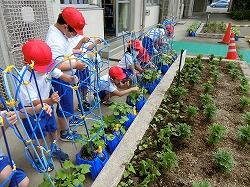間引きをしたアサガオは、花壇に植えて教室の前にアサガオのグリーンカーテンを作る予定です。