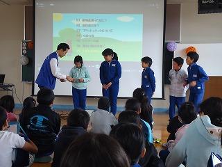 シッティングバレーボールを始めたいきさつや北京・ロンドンの2度のパラリンピックに出場した経験談などを分かりやすくお話ししていただきました。世界を相手に戦った力強く、優しい話でした。来年の東京パラリンピックに向けて日本のシッティングバレーボールチームを強くするために日夜がんばっているそうです。ジャパンチームをみんなで応援したいと思います。最後に金田選手、町教育長、全校児童とみんなで写真を撮りました。金田選手これからも頑張ってください。