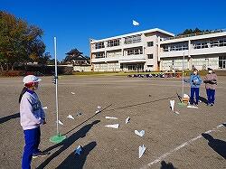 紙飛行機わく入れゲーム 紙飛行機を高く遠くまで飛ばして得点を競いました。