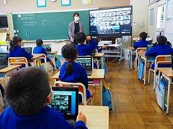 臨時休校や分散登校などに備えて、学校ではタブレットパソコンを使った授業の準備を進めています。今日は、益子町教育委員会から2人の指導主事の先生に来ていただき、タブレットパソコンを使ってGoogleMeetを活用した授業を行いました。