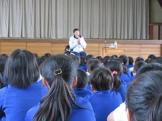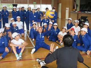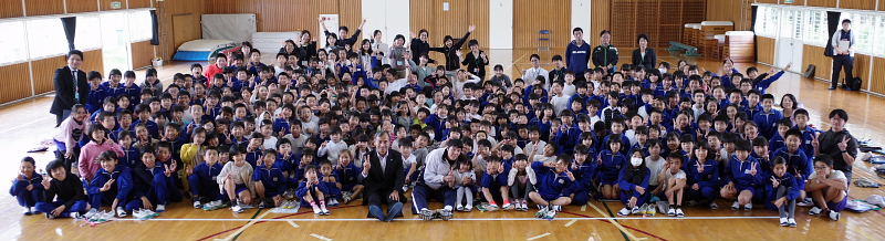 シッティングバレーボールを始めたいきさつや北京・ロンドンの2度のパラリンピックに出場した経験談などを分かりやすくお話ししていただきました。世界を相手に戦った力強く、優しい話でした。来年の東京パラリンピックに向けて日本のシッティングバレーボールチームを強くするために日夜がんばっているそうです。ジャパンチームをみんなで応援したいと思います。最後に金田選手、町教育長、全校児童とみんなで写真を撮りました。金田選手これからも頑張ってください。