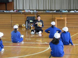 シッティングバレーボール体験では、6年生一人一人とトスやスパイクをしたり円陣パスの練習をしたり、楽しく体験することができました。