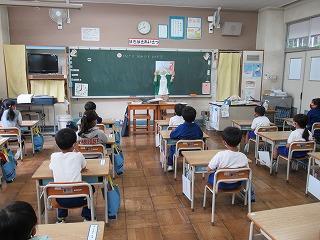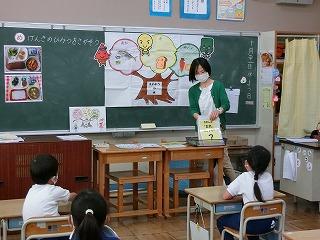 栄養教諭の先生による食育の授業がありました。体の中にある「えいようの木」をバランス良く、大きく育てるためには、好き嫌いをしないことが大切だということを学びました。その後の給食は、全員が頑張って食べていました。
