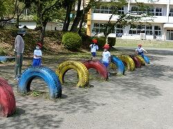 2組は、タイヤ跳びを使ってジグザグに走ることや登り棒、鉄棒をしました。