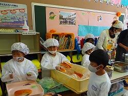 給食当番の仕事や自分の給食を作ることにもだいぶ慣れてきました。コッペパンにジャムを塗ることが大変そうでしたが、みんながんばっていました。