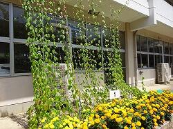 【4年生】ヘチマとゴーヤの葉やつるがどんどん生長しています。少しずつゴーヤが実ってきました。