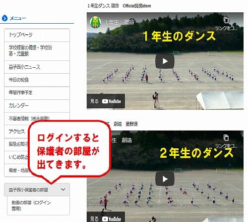 体育発表会の動画を学校ホームページ内で公開しています。限定公開のYouTubeを利用しています。週末の視聴者数が多くなりました。動画の公開は10月末までとします。保護者用IDとパスワードでログインして出てくる「保護者の部屋」で公開していますので、ぜひご覧ください。
