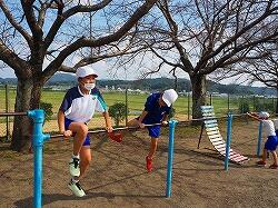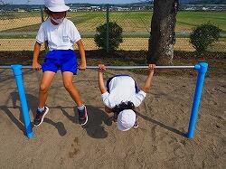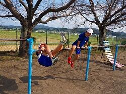 新設の低鉄棒が人気です。新しい鉄棒はピカピカ光っています。