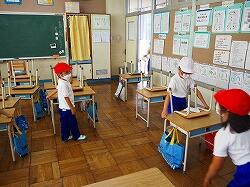 昼休み終了のチャイムが鳴ると一斉に駆けて掃除の場所に向かいます。本校の児童は、休み時間終了のチャイムと同時に走って教室に戻ります。