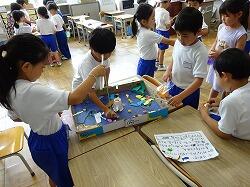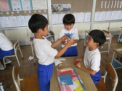今日も気温がとても高いです。昼休み、子供たちは室内で楽しく過ごしています。
