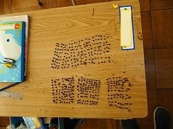 1年生は算数で「おおきなかず」を学習しています。自分で収穫したアサガオの種を机の上に工夫して並べて、100以上の大きな数を数えることができました。
