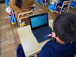 益子町教育委員会から派遣されたICTアドバイザーが来校し、タブレットパソコンを使った授業を2年生が初めて行いました。一人一台に渡された自分のパソコンを手にして、わくわくしながら学習に取り組んでいました。今日はログインの仕方(パスワードの変更作業も含む)を学習しました。2年生はまだローマ字を習っていないため、ログイン時の英語キーの入力がたいへんでした。ログイン後には、お絵かきアプリを使って自分の好きな絵を描き、グループで絵を共有することができました。一人一台のGIGAスクール構想が始まりました。