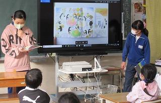 今日の朝の学習の時間に、図書委員による読み聞かせを行いました。1年生が自分の座席から見えるように、本のページを画面に写しながら読みました。よく話を聞いて、お話の内容に関する問題にも答えていました。来週は2年1組と2組で行いますので、楽しみにしていてください。