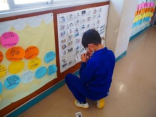 休み時間、廊下に掲示してある外国語コーナーのカードが外れて落ちているのを見て、自分のセロハンテープを持ってきて貼り直している5年生の姿を見ました。この5年生は、今までにもはがれている掲示物を進んで元通りに貼り直してくれていたそうです。「先生、落ちてました。」と落ちていた掲示物の報告をする児童はいますが、自分で貼り直す児童は少ないです。今日は心優しく、行動力のある児童を紹介しました。ありがとう。