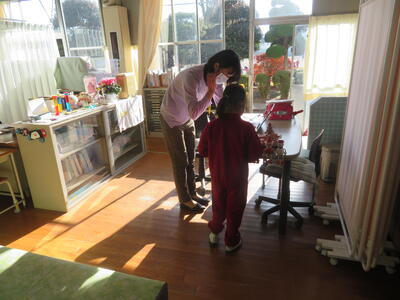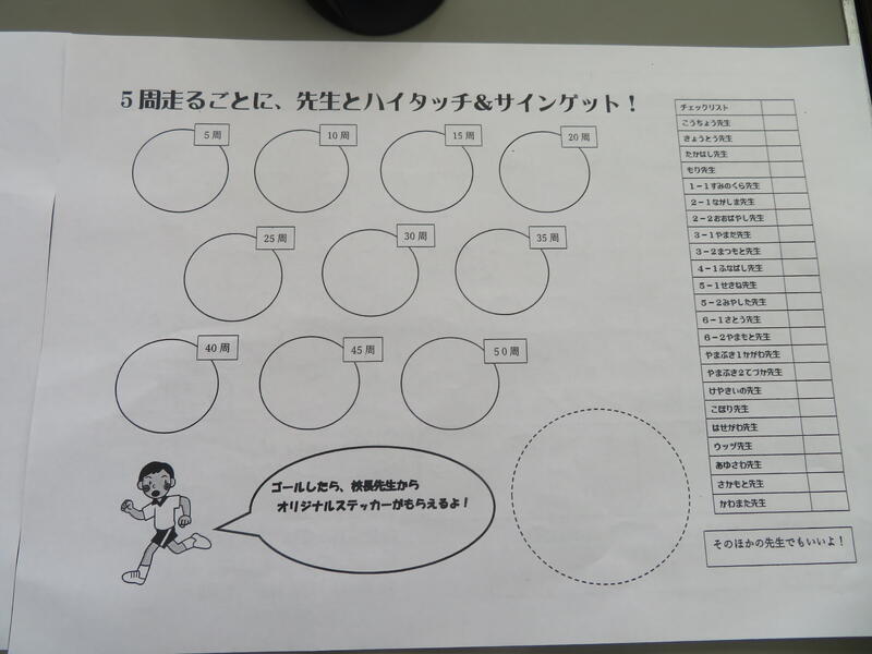 今年度は5周ごとに走ったら先生たちとハイタッチし、サインやはんこをもらうようなカードを工夫しています。走ることはあまり好きではない子も、先生たちにサインをもらい、「がんばったね」と言葉を掛けられると、笑顔を返してくれています。